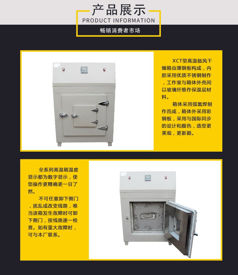1.XCT型高溫鼓風干燥箱由薄鋼板構(gòu)成,內(nèi)膽采用優(yōu)質(zhì)不銹鋼制作,工作室與箱體外殼間以玻璃纖維作保溫層材料。